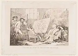 ———— Interior. A woman is kneeling on a low bed, while an old man, entirely dressed, and with a bag wig and hat on, is examining her through his spectacles; with his right hand he holds up her shift above her navel; the woman has on a night cap and slippers. This composition has been imitated in an engraving, 6 by 8+38 inches (150 by 210 mm), partly line and partly stipple, badly executed, with title in the left hand corner The Connoisseur.[86]