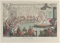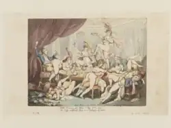 Lord Barr—res[e] Great Bottle Club[f] Interior. Six couples, around a table, are disporting themselves in the lewdest manner, and in various attitudes; all the women are naked up to the waist; one girl, with her clothes tucked over one arm, is dancing on the table, a punch-bowl in her hand. "Drunkenness and debauchery run riot throughout the composition, which is full of movement. The drawing is not bad, but is scarcely more than in outline."[56] [59][60]