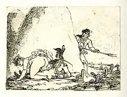 Rural Sports or Coney Hunting In a field surrounded by trees, three girls, two standing and one reclining on a bank, are exposing themselves to an old man seated on a stile, with a stick between his legs, and in wig and three cornered hat; a younger man stands behind him, and points to the women. A large tree rises to the left, the branches of which spread over three parts of the picture. "This is an agreeable composition, well drawn and etched; all five figures are full of life."[86] [87]