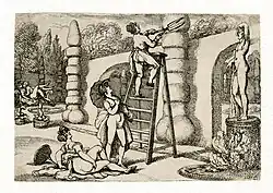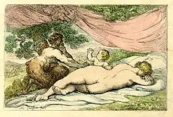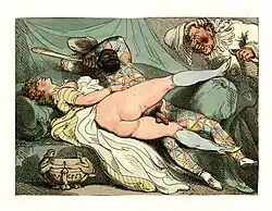 ———— Interior. A harlequin and columbine are lying together asleep on a couch, the girl's plump hinder parts are entirely bare, her right leg thrown over her companion, while his member, in a flaccid state, is reposing on her left thigh; a pierrot is discovering them. In the left hand fore corner is a vase, with phallic designs. See Commedia dell'arte.[61] [67][68]