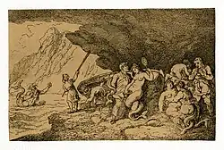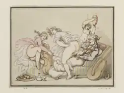 ———— Four musicians, one a black man, are playing; the stiff members of three of them are bare. Another, entirely clothed, and seated on a drum, is playing the flute, with a naked girl sitting on his lap, and playing the tambourine. A very fat female child, quite naked (to the right) is striking the triangle. "The naked girl, the central figure, is well drawn, her face is pleasing, and has a good deal of expression; … This is a strange and original composition."[61]