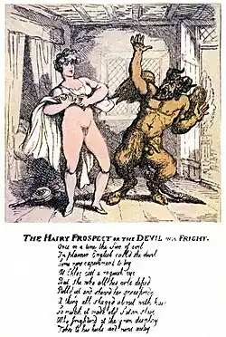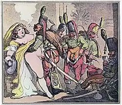 The Rival Knights or the Englishman in Paris Interior. A girl, with a large feather in her head, her shift tucked up round her waist, kneels on a bed between two old men with their breeches down—one very fat, the other slight and small,—she holds the member of each in her hands, and appears to be drawing them to her; the men, with clenched fists, are making pugnacious demonstrations behind her back. On the mantle-piece, right, are a bottle, and a monkey, with member erect, playing the fiddle. "The drawing and finish are good, especially of the girl's posteriors—a favourite part with Rowlandson,—and the composition has much life in it."[23] [24][25]