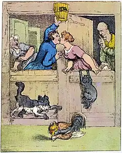 ———— Exterior of a cottage; to the right and left of which are two couples in the act; an old woman with a broom is beating two dogs stuck together, while another woman from the window is endeavouring to drive away two cats who are amusing themselves on the roof. "The drawing is poor, and the engraving rough, the animals, as usual, are very badly done."[61]