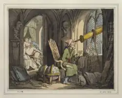 The Star Gazer "I have known many a Man to have been made a Cuckold of in the twinkling of a Star". An interior; the walls arched, and the floor strewed with books and two globes; with a dog in the foreground. An old man, in dressing gown and slippers, with open mouth, is gazing through a telescope; while, in an adjoining room, of which the doors are half open, a couple are in the act upon a bed. "The moon-light pouring in through the window at which the old man sits is well managed."[8] [9][10][11]