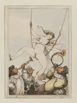 ———— An old man and a girl are swinging in separate swings; the girl's legs, hips and breasts are exposed, and in her head are two large feathers; the old man is very ugly, wears a cocked hat, pigtail, spectacles, and top boots with spurs; his breeches are at his knees, and his belly and member exposed. In the distance is a river with two sailing boats, &c. Titled by Schiff: "The Swings"[104] [105]