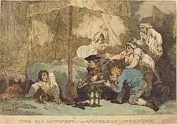 Out Posts of a Camp Exterior. A soldier standing upright, his pigtail sticking out, and his breeches about his knees, is enjoying a plump girl seated on a drum underneath a tree. Another soldier at some little distance, seated on the ground, is examining the genitals of a lass extended before him. In the distance are tents. "[T]he perspective is faulty."[29] [32][33]