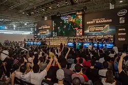 By the end of 2011, Dota 2 was already one of the highest-paying esport games, second only to StarCraft II.[83] At E3 2013, South Korean company Nexon announced the investment of ₩2 billion (approximately US$1.7 million) into local leagues in the country, which coincided with their distribution partnership with Valve for the game.[84] In February 2015, Valve sponsored Dota 2 Asia Championships was held in Shanghai with a prize pool of over $3 million, raised through compendium sales.[85][86] Since then, other Dota 2 Asia Championships have taken place, with it being sometimes being referred to as the "Chinese International".[87][88] In total, professional Dota 2 tournaments had earned teams and players over $100 million by June 2017, with over half of that being awarded at the International tournaments, making it the highest earning esport game by a margin of nearly $60 million.[89]