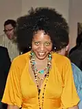 A typical texture of Black African hair that has not been altered by hot combs, flat irons, or chemicals (by perming, relaxing, or straightening). Each strand of this hair type grows in a tiny spring-like, corkscrew shape (though there are different textures and degrees of waviness, curliness, and kinkiness across the entire population). The overall effect is such that, despite relatively fewer actual hair shafts compared to straight hair,[14] this texture appears (and feels) denser than its straight counterparts. The effect may be referred to as "thick", "bushy", or "woolly", and has at times been criticized for appearing "unpolished", "unkempt" or "unprofessional". In the 2010s, there was a resurgence in choosing the natural look among Black African Americans. |