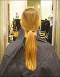 When all of the hair is collected and fixed with a hair tie or clip close to the scalp, with the hair hanging free, resembling the tail of a pony. |