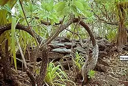 | Windward Islet | 114,000 m2 | Named for its position as the largest of the Windward Islets, this islet was totally cleared in 1920 and planted with Cocos; however, during the 1988 survey, the islet had largely recovered from this disturbance, and the islet exhibited a typical profile of herb mat, Tournefortia, and Pisonia-Cordia forest, with no Cocos present. | ![]() Tournefortia and a rare stand of Scaevola on the rim of Windward. | |