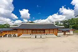 A complex used for funerary rites and as a temporary residence. It did not exist before the Imjin War;[147] it was first built in 1865.[51] It was used for the 1890 funeral of Queen Sinjeong and 1895 funeral of Empress Myeongseong.[148][51] During the colonial period, it was moved to Deoksugung, where it was later demolished.[51] The Capital Defense Command occupied its former spot until 1996.[149] It was restored in 2005.[150] Buildings in the complex include Yeongsajae (영사재; 永思齋; Yŏngsajae), Gongmukjae (공묵재; 恭默齋; Kongmukchae), and Sungmundang (숙문당; 肅聞堂; Sungmundang).[151] |