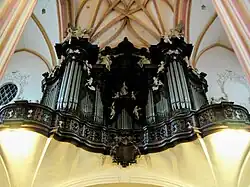 One of the largest organs in Central Europe built by the Wrocław master Michael Engler, commissioned by the sea provost František Gregor Gianini. The instrument had originally 3 manuals, 44 registers and about 2,500 pipes. Between 1959 and 1971 the organ was substantially changed to the current size. | |