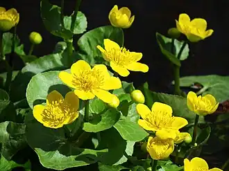 | Caltha palustris | marsh-marigold, kingcup | Ranunculaceae | It contains several active substances of which the most important from a toxicological point of view is protoanemonin. Ingesting large quantities of the plant may cause convulsions, burning of the throat, vomiting, bloody diarrhea, dizziness, and fainting. Contact of the skin or mucous membranes with the juices can cause blistering or inflammation, and gastric illness if ingested. Younger parts seem to contain lower toxin concentrations and heating breaks these substances down. Small amounts of Caltha in hay do not cause problems when fed to livestock, but larger quantities can lead to gastric illness.[74] | |