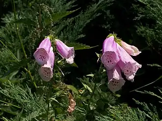 | Digitalis purpurea | foxglove | Plantaginaceae | The leaves, seeds, and flowers are poisonous, containing cardiac or other steroid glycosides. These cause irregular heartbeat, general digestive upset, and confusion; can be fatal. | |