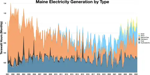 This is a list of electricity-generating power stations in the U.S. state of Maine, sorted by type and name. In 2023, Maine had a total summer capacity of 5,252 MW through all of its power plants, and a net generation of 12,512 GWh.[2] In 2024, the electrical energy generation mix was 30.4% natural gas, 27.5% hydroelectric, 20.6% wind, 11% biomass, 7.8% solar, 0.4% petroleum, 0.2% coal, and 2.1% other. Small-scale solar, which includes customer-owned photovoltaic panels, delivered an additional net 1,015 GWh of energy to the state's electrical grid in 2024. This was nearly equal to the 1,077 GWh generated by Maine's utility-scale photovoltaic plants.[1]