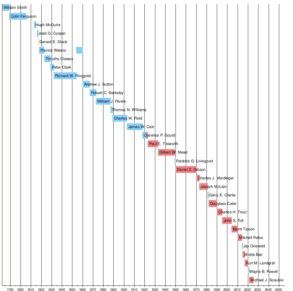 Washington College is a private liberal arts college in Chestertown, Maryland, which is on the Eastern Shore of Maryland. The college was founded in 1782 by William Smith, but is the successor institution to the earlier Kent County Free School, which was founded in 1732.[1] From the college's founding until 1922 the executive officer of the college was known as the principal of the college; subsequently, the executive officer is the president of the college.[2][a] While the title changed, the office is considered to be the same and officeholders who were referred to as principals by their contemporaries are now referred to as presidents.[b] Before the title change in 1922, the president of Washington College was the president of the Board of Visitors and Governors; since 1922, that position is the chair of the Board of Visitors and Governors.[2]