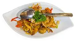 | Kaeng som | Thailand | A sour and spicy shrimp curry or soup with vegetables, with a characteristic sour taste which comes from tamarind. A paste called nam phrik kaeng som[16] which includes shrimp paste, shallots, and sometimes red chili peppers forms the base for the curry. The curry is usually sweetened with palm sugar and served with steamed rice. Fish that keep their consistency after boiling, such as the common snakehead, can be used instead of shrimp. Another variant uses fish eggs.[17] Kaeng som is . | |||||