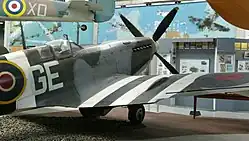 - Spitfire LF Mk.XVIe RR263. Built in 1944 and delivered to the RAF that year with 2nd Tactical Air Force. The Spitfire was loaned to Vickers Supermarine for experimental reasons in 1949 before moving to storage. Used as a static backdrop for the Reach for the Sky movie and later was on a plinth at RAF Kenley as TB597, codes GW-B. Later overhauled and repainted again as TB597 as GW-B before being put on display at Musée de l’air et de l’espace, Le Bourget.[60]