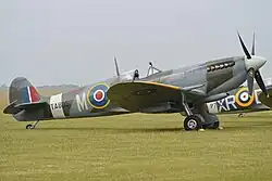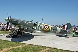 - Spitfire Tr.9 MJ772 (PH-KDH). Served with 341 Squadron, Royal Air Force as NL-W then with 340 Squadron as GW-A. Sold to Vickers-Armstrongs in 1950, converted to two-seat trainer. Carried Class B markings G-15-172. To Irish Air Corps in May 1951 as IAC 159. Withdrawn from flying in 1960. Sold to Film Aviation Services in November 1963 and stored at Biggin Hill. Sold to COGEA, Belgium in May 1964 and stored at Ostend Airport. Sold to Tony Samuelson in 1965 and registered G-AVAV in November 1966. Restored to airworthyness in July 1967. Leased to Spitfire Productions Ltd for use in the film Battle of Britain. A forced landing was made at Little Staughton on 9 July 1968 due to engine failure, and subsequently returned to flying condition. Later sold to Sir William Roberts and displayed as part of the Strathallan Collection, coded NL-R. Sold to Doug Champlin of Enid, Arizona, registered N8R. Later registered in Germany as D-FMKN.[85] Suffered off-airport landing in field, near Woodchurch, Kent, United Kingdom, on 7 September 2015. Pilot uninjured.[86][87] As of March 2019, airworthy owned by Warbird Experiences Ltd, based at Biggin Hill airfield.[88] In August 2021, MJ772 was flown to its new home in The Netherlands.[89]