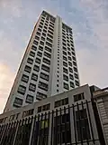Another building to be called Auckland's first skyscraper was the Civic Administration Building (now shortened to CAB Building), built in 1966. The twenty-storey tower was comfortably the tallest building in Auckland at the time, and housed the city council from its completion until it left in 2014.[5][6] An example of modernist architecture, it incorporated unique building techniques, such as flexible steel framing, aluminium extrusions, neoprene window seals and ceramic acoustic tiles.[7]