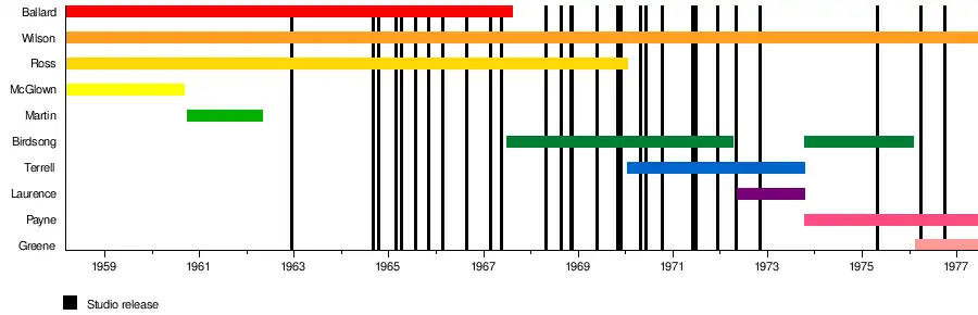 This page is a chronology of the Motown singing group the Supremes. It lists the members of the group during all phases of the group's history, and also includes a timeline.
