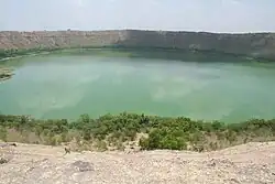 - Lonar crater lake: Although located in the Buldana district of Maharashtra, it is mostly accessed by tourists from Aurangabad. Lonar is the world's third largest crater. It has its genesis nearly 50,000 years ago, when a two million-ton meteorite impacted the earth to create a depression 1.83 kilometers in diameter and 150 meters deep. Lonar Lake is a saltwater lake, which was created by a meteor hitting the Earth during the Pleistocene Epoch. The impact crater thereby formed is the only hypervelocity meteoritic impact crater on basalt rock. A lake that evolved in the resulting basaltic rock formation, it is both saline and alkaline in nature.