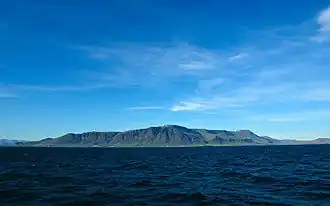- Esja, (Esjan), a 914 m (2,999 ft) mountain situated in the south-west of Iceland, about ten kilometres north of Iceland's capital city Reykjavík. Esja is not a single mountain, but a volcanic mountain range, made from basalt and tuff. Esja was built up at the end of the Pleistocene with the beginning of the Ice Age. During the warm periods lava flowed, and in the cold periods ridges of tuff were built up under the glacier. The western part of the mountain range is the oldest (about 3.2 million years) and the eastern part is the youngest (about 1.8 million years).[6] Part of the Reykjanes volcanic zone (RVZ).