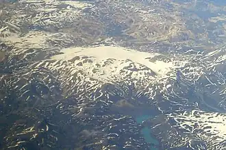 - Esjufjöll, subglacial volcano at the SE part of the Vatnajökull icecap. A strict nature reserve.[7] The volcanic system consists of the Snaehetta central volcano with a large caldera. Most of the volcano, including the 40 km2 caldera, is covered by the icecap. On the other hand, are parts of the SE flank exposed in NW-SE-trending ridges.[8] Most of the exposed rocks are mildly alkaline basalts, but there are also small amounts of rhyolitic rocks.[8] Part of the East volcanic zone (EVZ) (or Oræfi Volcanic Belt.[9][10])