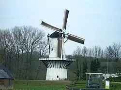 Overasselt Zeldenrust Standerdmolen 1972 Molendatabase entry (in Dutch). Built at Geertruidenberg, North Brabant in 1736, moved to Raamsdonksveer in 1890, moved here in 1972.