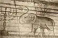 1750–1941 | The synagogue building was a wooden structure built on a stone foundation. The walls of were cut from edged logs into a clean corner. The central log house was dominant in height, to which side log houses were adjoined as covered galleries. A pentagonal structure was added to the main facade, which covered the main entrance. The building was covered with a high gable roof, with a complex plan and numerous outbuildings. In the end of 19th - beginning of 20th century the roof was covered with tin.[6] The interior was almost entirely covered with magnificent polychromes made in 1745 by the Słuck painter Chaim ben Yitzchak ha-Levi Segal. Murals, made on boards, represented the images of 12 signs of the zodiac, mythical animals and cities. Some researchers noted that under the image of mythical cities features of Mogilev from the times of the Polish-Lithuanian Commonwealth were visible. These murals were studied by El Lissitzky and Issachar Ber Ryback. | ![]() ![]()