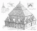 It consisted of a square (12 × 12 m) large main hall. The walls were 6 m high; it was 10.20 m to the highest point of the vault, and the floor was a few steps lower than the outer rooms. On the west side there was a vestibule and above it a gallery with arcades. A two-story corner pavilion stood to the right and left. The north and south sides were flanked by women's dreams. The main building had a three- story tent roof, with the upper step transitioning to an octagonal point. The corner pavilions had a two-story roof. Inside, four wooden pillars supported the vault; they divided the floor plan into nine equally sized fields. In the middle stood the bima; it was in the shape of an octagonal arbor with a canopy with a crown on the top. | ![]()