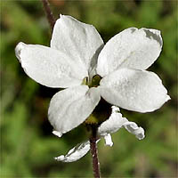 The stem bears 2 to 8 flowers, each in a cuplike calyx of red or green sepals. The five petals are white, under one centimeter long, and smooth along the edges or very shallowly toothed.