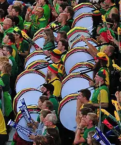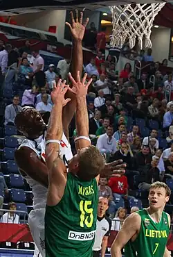 For the fourth post-independence Olympics, basketball captain Saulius Štombergas was given the honor to bear the Lithuanian flag during the opening ceremony.[103] The Olympic basketball for Lithuania started slowly, laboring to a victory against the African champions Angola 78–63, with their opponents shooting an excellent 52% from the three-point line. Lithuanian national team also had difficulties with Puerto Rico, depending on a high average of three-pointers to beat the NBA-heavy squad by 98–90. Then Lithuanians, in front of 12,000 spectators, achieved revenge against their Greek hosts, defeating them 98–76. The next match would be against the United States, which again featured major NBA stars such as Allen Iverson, Tim Duncan, and LeBron James, but had already been proven as faltering following a defeat to Puerto Rico. Lithuania managed to beat the United States 94–90, only the fourth defeat by the Americans in the Olympic stage.[104] Jasikevičius, who had lost a possible buzzer beater against the Dream Team four years before, managed to score 28 points, including a decisive 10-point barrage in 69 seconds that gave Lithuania the lead in the final minutes.[105] While the fifth game, versus Australia, was not significant for the group standings as the Lithuanians had already secured the first spot in the group, the Lithuanians still won 100–85, maintaining their good run.[106]