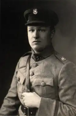 In the summer of 1918, a Lithuanian committee established in Chelyabinsk accepted a resolution to create a Lithuanian military unit; it successfully negotiated support from military units of the Entente and proposed for Henryk Suchenek-Suchecki that a uniquely Lithuanian unit should be split and formed.[1] According to the agreement, the 7th Lithuanian Company (led by Petras Linkevičius) subordinate to the 1st Polish Rifle Regiment was established on 19 August in Buguruslan.[3] The company at first consisted of 3 officers and 116 soldiers.[4] Soldiers of the company would wear Lithuanian-themed colors, distinguishing them from their Polish allies.[2]