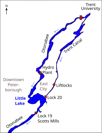 Peterborough is about 50 kilometres (31 mi) north of Lake Ontario and south of the Kawartha Lakes. The Otonabee River flows down from the Kawartha Lakes through Peterborough, where it is joined by Jackson creek at Little Lake, and continues south to Rice Lake. From there the Trent River leads to Lake Ontario.[1] The Otonabee River drops by 144 feet (44 m) from Katchewanooka Lake to Little Lake.[2] The Trent Canal leaves the Otonabee River upstream from Little Lake and runs parallel to the river, then rejoins it in Little Lake. With the Otonabee to the west and the canal to the east, the district of Peterborough known as East City is an island.[3]