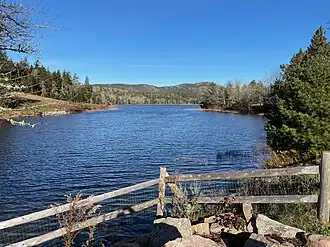 Little Long Pond is a pond in Seal Harbor, Maine, United States, at the southern end of Mount Desert Island.[2] Fed by Jordan Stream, a runoff of Jordan Pond, the pond is separated from Bracy Cove at the Gulf of Maine by a narrow causeway carrying State Route 3. It is officially called Long Pond, but has been given the Little prefix to differentiate it from other Long Ponds in the area.[3] A 2.2-mile (3.5 km) trail circumnavigates the pond, while an offshoot leads to Jordan Pond House. Mostly flat on its eastern side, it rises somewhat from the pond's northern end to around halfway down its western side.[4]