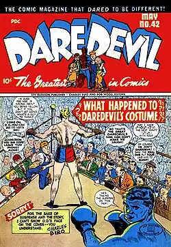 As superheroes declined in popularity, Daredevil's role was gradually reduced to introducing the Wise Guys at the beginning of their stories.[3] Starting with issue #70 (January 1951), he disappeared completely; the book was still called Daredevil Comics, but only the Little Wise Guys remained.[4] The titular star briefly reappeared in issues #79 and 80, but that was the end of him.