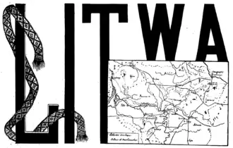 Litwa used different nameplates each year.[13] The nameplate of the first issue effectively defined which Lithuania it would write about – it included a traditional folk sash wrapping around the letter L[13] and a map of ethnographic Lithuania and not of historic Lithuania (i.e. the Grand Duchy of Lithuania).[14] The map was prepared and first published by Mečislovas Vasiliauskas in 1907.[15]
