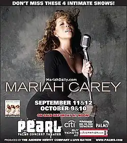 Carey announced the end of July on her official website that she was going to do four concerts at The Palms Resort & Casino in Las Vegas in the 2,500-seat Pearl Concert Theater.[2]
