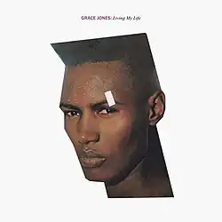The Living My Life cover picture has been described as famous as the music featured on the record itself.[6] Like the majority of Jones' artwork at that time, this one was created by her then-partner Jean-Paul Goude, this time with an additional contribution from Rob O'Connor. It features the singer's disembodied head cut out from the original photograph and pasted onto a blank white background in a way that gives her head and face an angular shape.[7] A piece of tape, or a plaster, has been pasted over her left eyebrow, and her forehead is covered with drops of water, or sweat. This cover, as many other Goude's designs for Jones, has won critical acclaim and has been an inspiration for other artists ever since.[8]