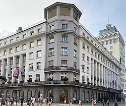 ![]() LKB head office building, since 1991 the seat of the Bank of Slovenia (N.B. the Nebotičnik high-rise on the right is a separate building) | |