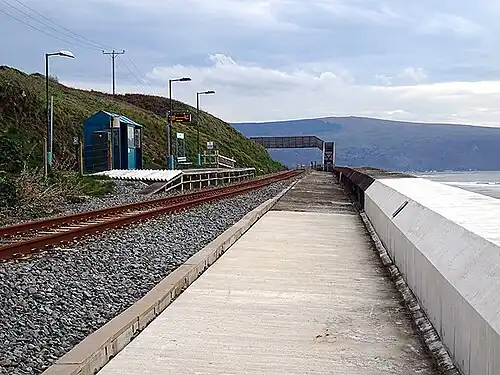 The station platform is located on a narrow ledge below the village of Llanaber and immediately above a rocky beach.