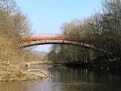 - Brynderwen Bridge. Built in 1852, close to Abermule, this is a single 109-ft span across the river Severn (and a smaller span across the canal) on five iron girders. Designed by Thomas Penson. The bridge came from Brymbo ironworks near Wrexham, and would have been transported to the site by the Montgomeryshire Canal. Grade II* listed.[44]