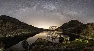 Llyn Ogwen (Welsh: [ˈɬɪn ˈɔɡʊɛn]) is a ribbon lake in north-west Wales. It lies alongside the A5 road between two mountain ranges of Snowdonia, the Carneddau and the Glyderau. Somewhat unusually, the county boundary at this point is drawn so that the lake itself lies in the county of Gwynedd, but all the surrounding land (excluding the outflow) lies in Conwy County Borough.