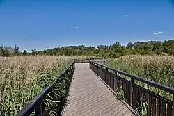 The Josefsteg is a 135-meter-long pedestrian bridge in Vienna's Lobau area, spanning the Schröderwasser. It is surrounded by a sea of common reed (Phragmites australis). The bridge was rebuilt in 2020.[7]