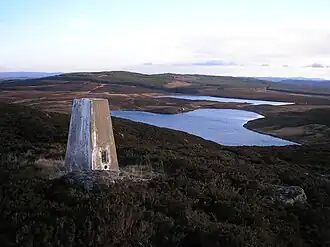 The view from the cairn next to the trig point on Craig Lochie. Loch Skiach and Little Loch Skiach can be seen in the distance. The hill directly above the trig point is Elrick More, which is only 4 m (13 ft) lower than the summit of Craig Lochie.
