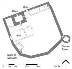 The castle comprises a rectangular courtyard surrounded by a curtain wall, with a tower house, or keep, at one corner, and the round Glassin Tower projecting from the opposite corner. The foundations of demolished ranges of buildings remain around two sides of the courtyard. Of the outer court, only an earth bank shows the position of the walls, with fragmentary remains of a bakehouse the only visible structures.