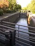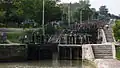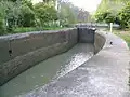 The Canal du Midi was built between 1666 and 1681 by Pierre-Paul Riquet to provide an inland water route through Southern France between the Atlantic at Bordeaux and the Mediterranean at Sète via the Garonne. The first design for the locks on the canal was a rectangular shape however due to a collapse of a side-wall early in the building program (exactly which lock is not recorded), Riquet modified his plans and rebuilt both existing and new locks with an ovoid chamber. They were typically 11m wide at the midpoint and 6m at the gates with an overall length of 30.5m.[1] Riquet also restricted the maximum rise to 2.9m so whereas previously he would have built one deep lock he instead used intermediate gates creating double, triple and sometimes quadruple chambers. During the Canal du Midi modernisation program of the 1970s several of these multiple chambers were converted into single "deep" locks with concrete side walls.