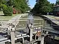 The lock gates were originally made of oak in the traditional mitre pattern with balance beams and each gate had a single large wooden sluice drawn up by a vertical screw.[1] The introduction of electric and hydraulic systems for both the lifting of the sluices and the opening of the gates has seen the removal of the balance beams and modern gates are of metal construction.