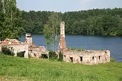 Ruins of the kvas brewery and of the pump-house previously belonging to the Alexander-Svirsky Monastery, on the background of Lake Roshchinskoye